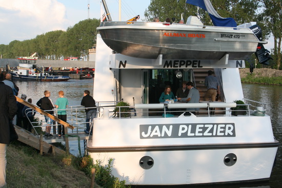 Ja, hier hadden we pas op de plaats gemaakt, bij de “Jan Plezier”, aan de noordelijke oever van het kanaal, bereikbaar via een rode loper en een trappetje…. “Pas op!”