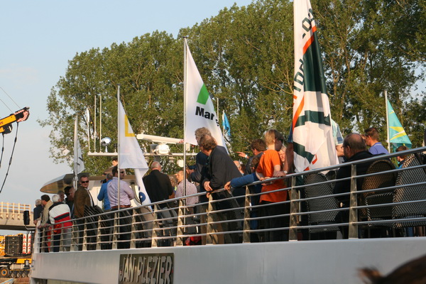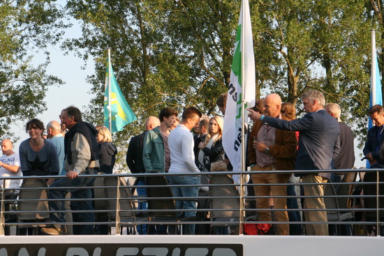 Het ontvangstcomité op het voorschip, als ik me niet vergis bestaande uit Geert Jan Goedhart (Prov. Groningen), charmant aangevuld door, vermoed ik, een vrouwelijke collega van de Provincie…