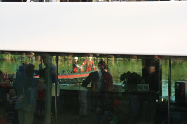 Een geinig beeld, maar geen goede foto…. In het glas de weerspiegeling van aan-de-kant-zitters, binnen gasten die benedendeks bleven, op de achtergrond in de zon twee zaterdagavondklussers….