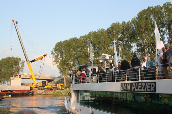 De twee Mammoeten op de achtergrond, het deel van de nieuwe brug waar vrijdag 23 mei de ‘korte’ liggers werden gelegd (toch nog plm. 40 meter), het hekwerk, de wachtende belangstellenden… Staan- en zitplaatsen…..