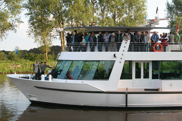 Ja, op het drukbevolkte voorschip bevindt zich Langestraat-aanwonende Lammert Kruizinga, van wie de tuin naast de tunnel in alle staten is, maar nog niet de goede… Wordt aan gewerkt! Zijn gezelschap? Hobby-fotograaf Geut, Zuidhorn-zanger Henk Priet in kleurrijke jas, en verder?