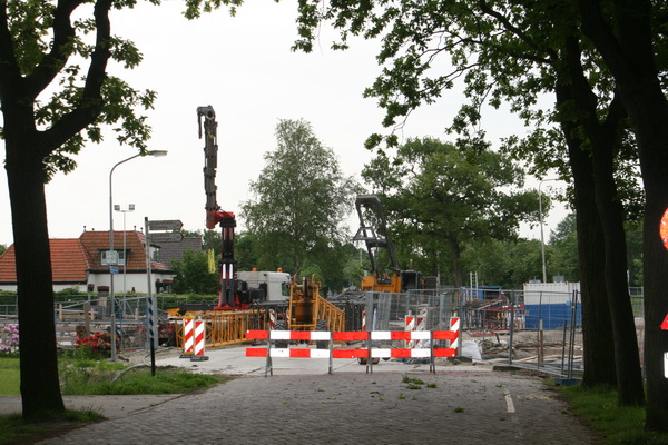 Het kieken op maandag 26 mei jongstleden gebeurde in drie fasen: Eerst aan de slag met de lutje Canon, maar toen was ineens de accu leeg… Terug naar huis, accu aan de oplader en met de Canon EOS D400 wederom naar de plek waar de grote kraan werd gedemonteerd. Die tweede reeks foto’s begint hier, op de hoek van Oosterweg/Langestraat bij de woonboerderij, waar een gemotoriseerde verkeersregelaar fietsers verwijst naar de Schippersstraatroute…