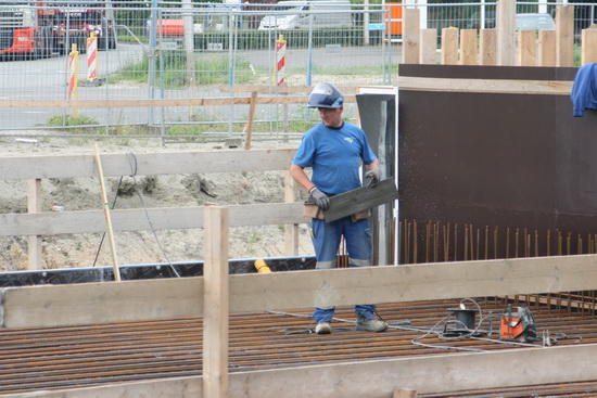 Via de Schippersstraat en de andere kant van het tunnelterrein naar de kraandemontage. Onderweg toch enkele tunnelbeelden gemaakt. Hier is betontimmerman Alje Kamminga bezig op het gewapende, nog te storten dek van moot 5. Een dag later komen de betonstorters….