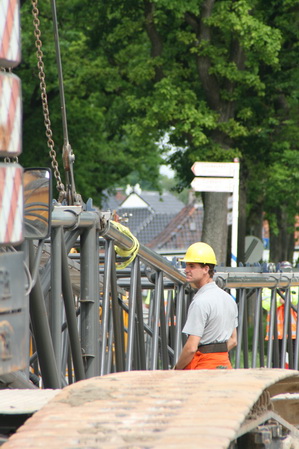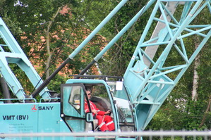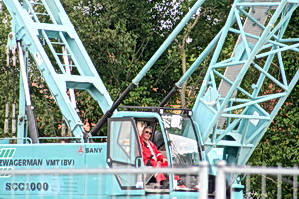 De kraan die deze week nog functioneerde, een Zwagerman, ten dienste van Mammoet (Assen), met machinist Louis (uit Wildervank). Komende maandag 2 juni wordt deze super kraan (nummer 2) uit elkaar gehaald en weggebracht…. Louis wuift al vast ten afscheid!