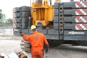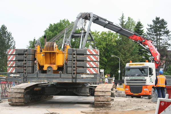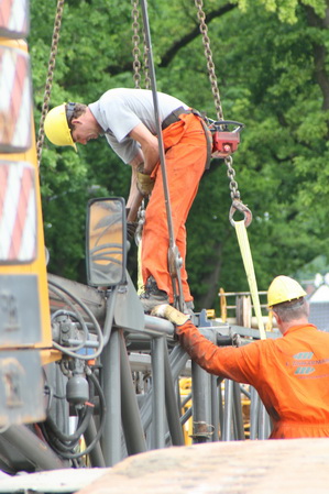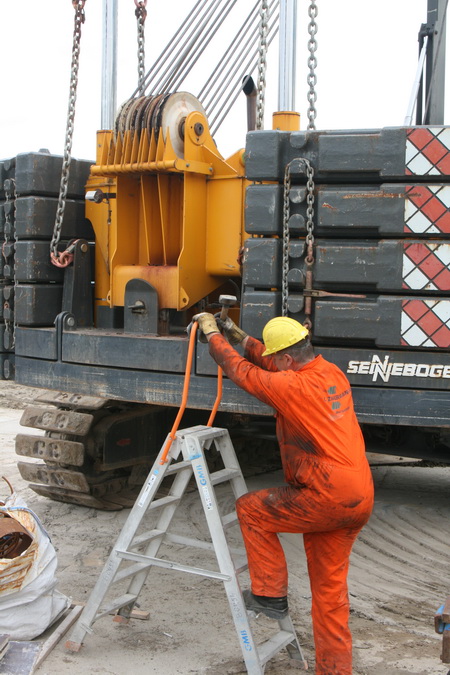 Het uit elkaar halen in volle gang. Rechts de fotograaf die alles vastlegt voor de firma Mammoet….