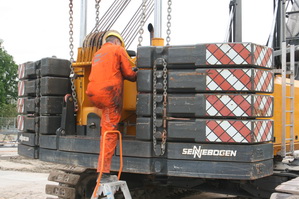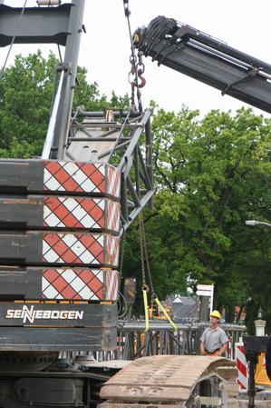 De Mammoet zelf ontkomt niet aan onttakeling… Het contragewicht wordt ontkoppeld….