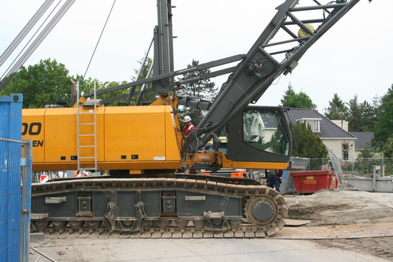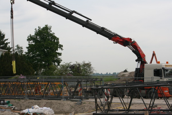 Rechts op de voorgrond het uiteinde van de super kraan. Dit deel lijkt hier veel groter dan hoog in de lucht…. (Hoogte? Meer dan 70 meter…)
