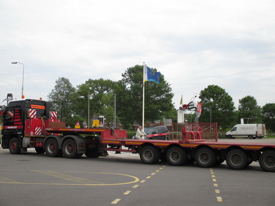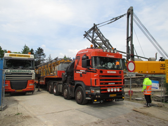 Zo is het duidelijker. Rechts de vrachtwagencombinatie van Remmers (Muntendam) die kraandelen gaat wegbrengen. De verkeersregelaar kijkt toe en ziet dat het goed gaat…