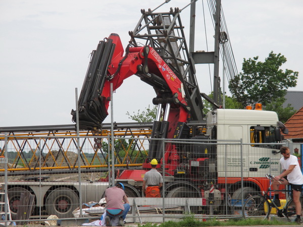 Vanaf de Industriewegkant naderend, zie ik dat er kraandelen op een vrachtwagen worden geladen, naast de Zwagermancombinatie. Het beeld vertekent. Op de voorgrond is stagiaire Pim bezig spandoeken te verwijderen die melding maakten van de Dag van de Bouw, the Saturday before…. Rechts een dorpsgenoot, die het hele gebeuren ook fotografisch vastlegt.