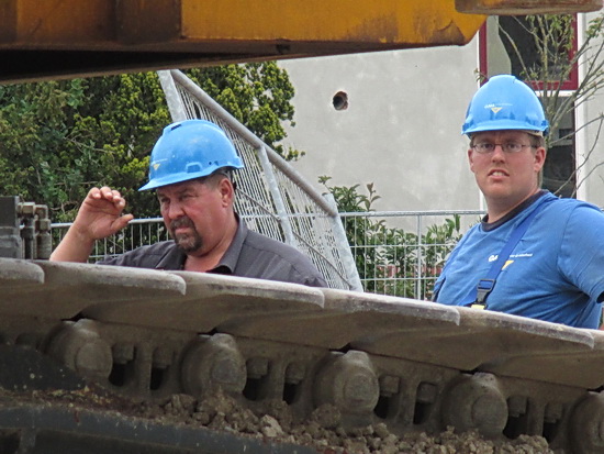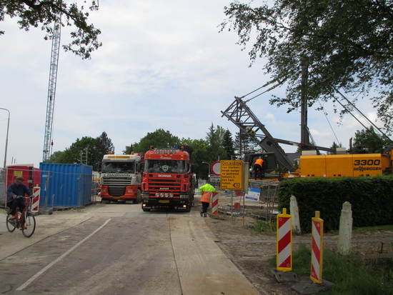 Ongeveer kwart over 2 ’s middags. De mammoetfotograaf overlegt met machinist Bertus over veiligheidsapps, de verkeersregelaar houdt de demontage in de gaten, links neemt tweewielerspecialist Klaas poolshoogte…