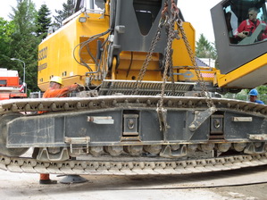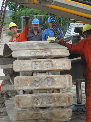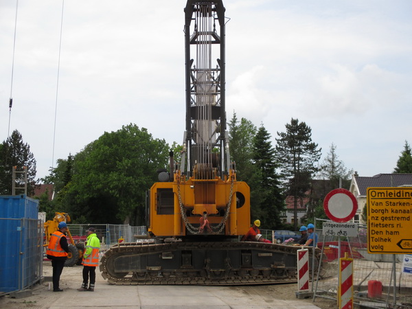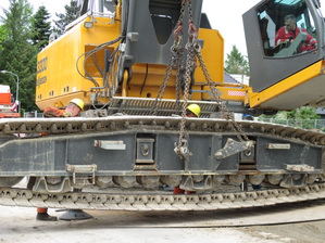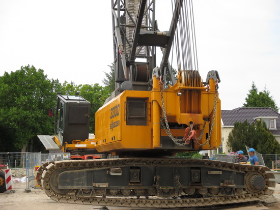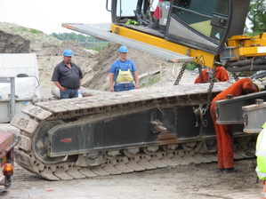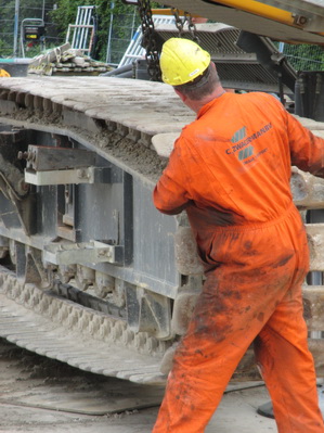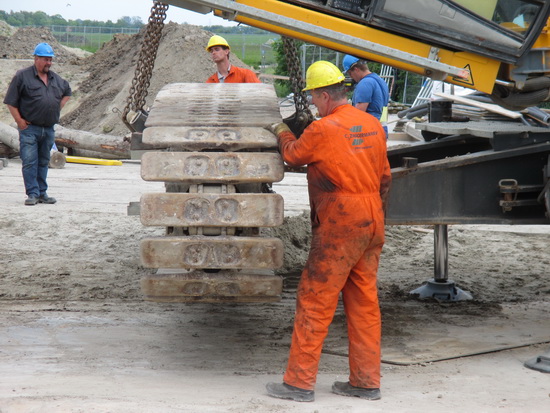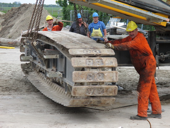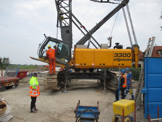 Het gaat dus om het weghalen van de rupsbanden. Het kraanlichaam staat inmiddels op palen….
