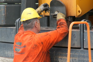 Deel 3 van de fotoserie over het ‘verwijderen’ van de super hijskraan van de firma Mammoet (Assen). Twee specialisten vlot en vaardig aan het werk, geassisteerd door bestuurder Bertus: