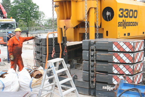 De breedgeschouderde Mammoet-specialist is voor geen kleintje vervaard, en voor een grote evenmin… Ontkoppelingshandelingen, de kraan wordt ontdaan van zijn gewichten…