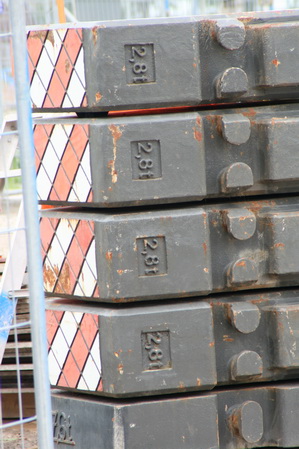 De gewichten op de voorgrond: 8 x 2,8 ton + 7,6 ton + 7,5 ton… (Samen??! Nee, de man in oranje overall niet meetellen…)