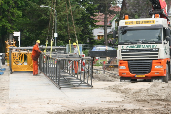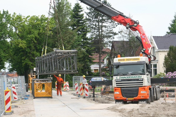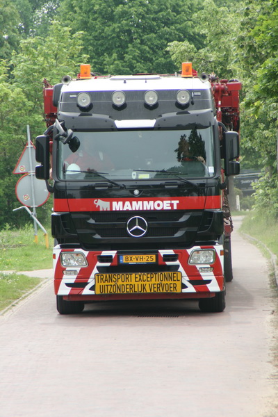 Vanuit de richting van het kanaal komt een andere vrachtwagencombinatie, een echte Mammoet. Afvoer van de telescoopkranen die bij de plaatsing van de grootste prefab brugliggers zijn gebruikt…