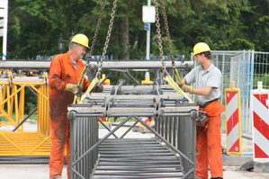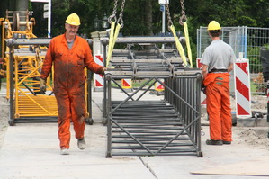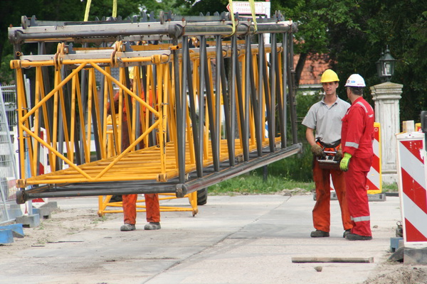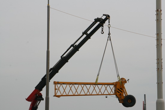 Het tillen van het tweede giekdelenpakket. Meteen op de vrachtwagen?