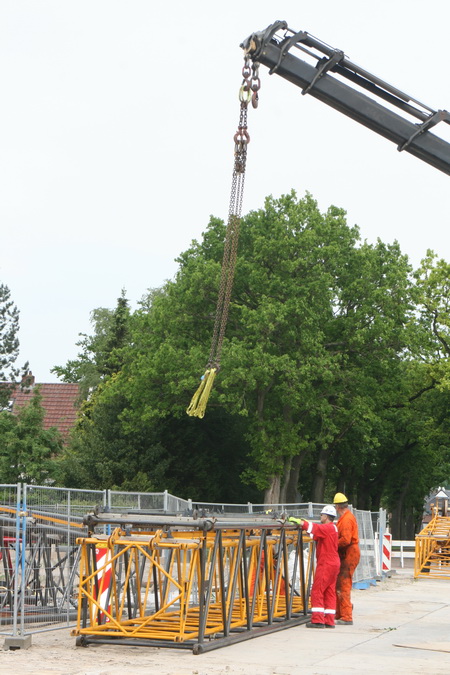 Delen van de superlange giek worden kundig in elkaar geschoven…..