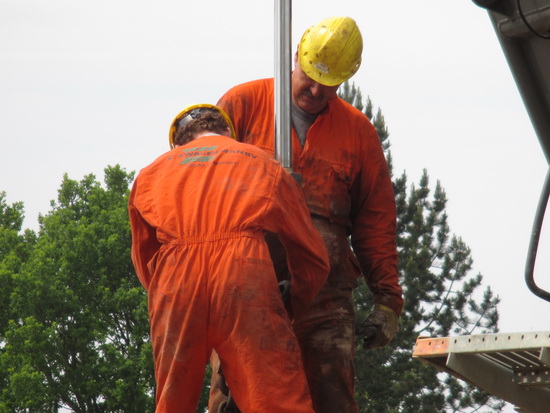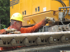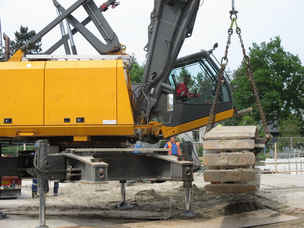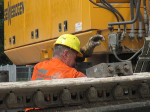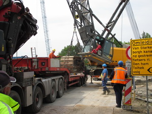 Dit zijn enorme krachten… En precisiewerk… Deze precies hier aan de kant, dan kan de andere er naast… Nee, het mag niet uitsteken, want er moet wel mee worden gereden…