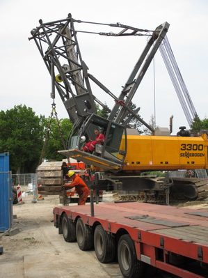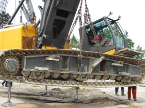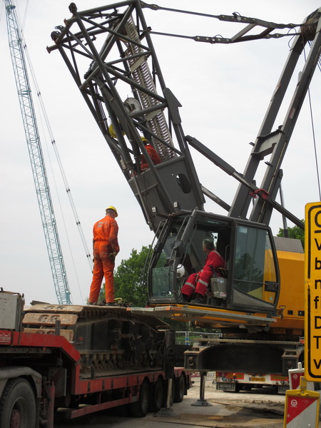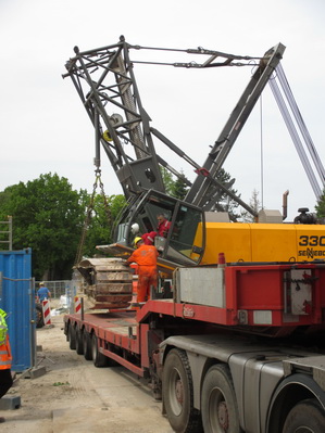 De half geamputeerde kraan kan zelf de tweede rups naar de vrachtwagen takelen…
