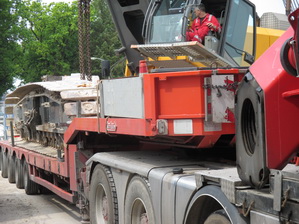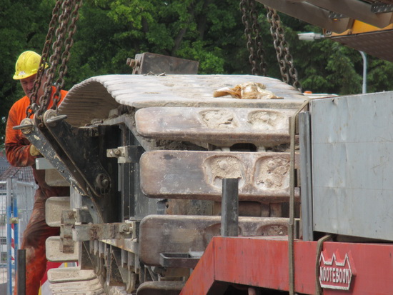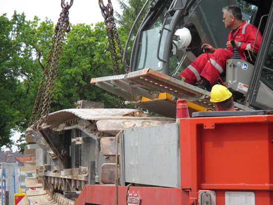 De manke machine in beeld… Geamputeerd en wel… Dan de andere rups ook maar op de vrachtwagen…