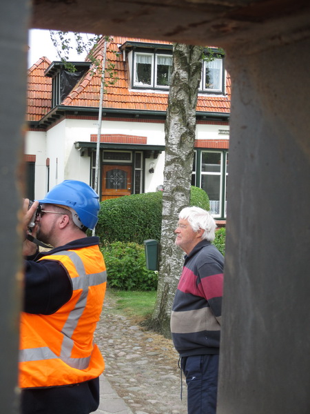 Door een kijkgat op de vrachtwagen: Links de Mammoetfotograaf, rechts buurtbewoner en medekieker Jan Thijs de Haan. Op de achtergrond huize Wieringa.