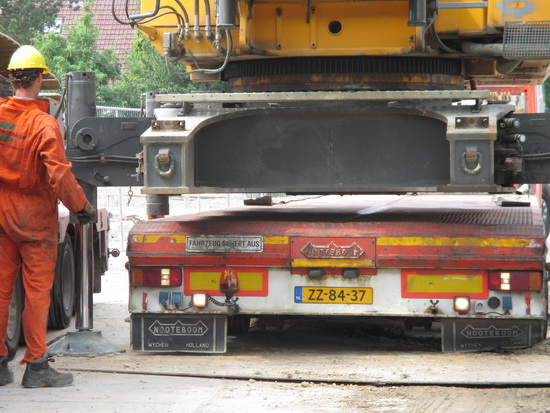 De kraanbody gaat ook op een aanhanger die er precies wordt ondergeschoven…. Ook dit is centimeterwerk! Zo’n achterste stel wielen kun je apart besturen… Lukt het?