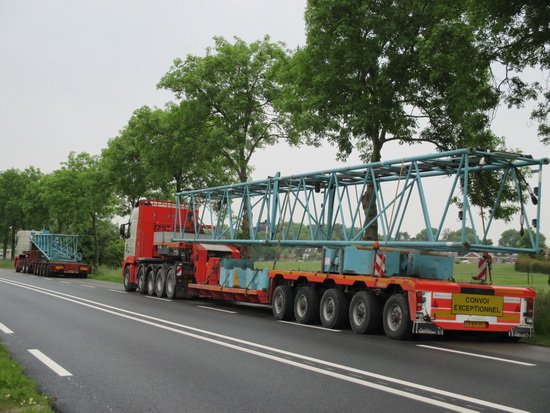 Deze delen van de giek staan/liggen al klaar op de vrachtwagens, kunnen zo naar de thuisbasis ter controle…..