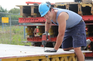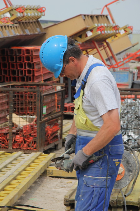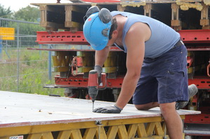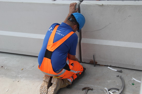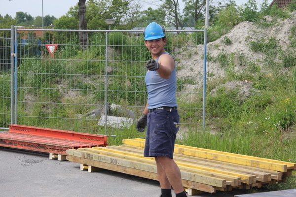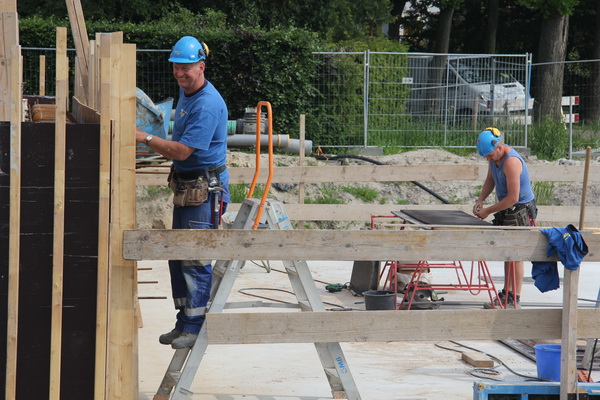 Betontimmerman Alje met zijn kompaan bij het bekisten van het afscheidingsmuurtje aan het eind van moot 5, de begrenzing van het overdekte tunneldeel aan de noordwestkant. Hij heeft alle reden tot lachen, het is woensdag veel langer mooi weer dan was voorspeld…. Vrijdag 6 juni wordt hier beton gestort, het laatste beton voor de tunnel bij Noordhorn.