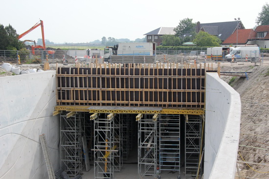 De tunnelopening aan de noordwestkant. Onder het dek van moot 5 zijn ook vaklui bezig met het verwijderen van ‘zolderbekisting’…. Vooraan bij de randwand zal de bekisting nog wel even blijven zitten, neem ik aan, tot na de betonstort.