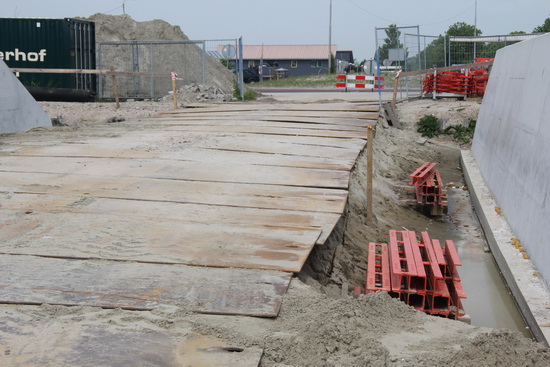 Moot 10, aan het uiteinde van de tunnel, op de achtergrond de rotonde. Nee, ik weet niet waarvoor die ‘rode balken’ dienen, rechts. Wel wordt hier later zand opgebracht en gaat Oosterhof Holman in de zomervakantie dit gedeelte meenemen bij het asfalteren van de verlegde N355.