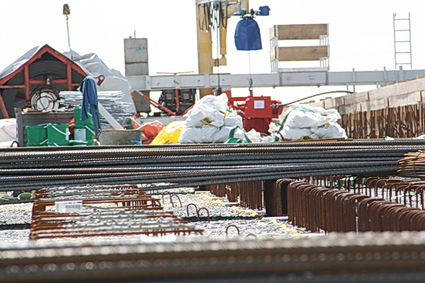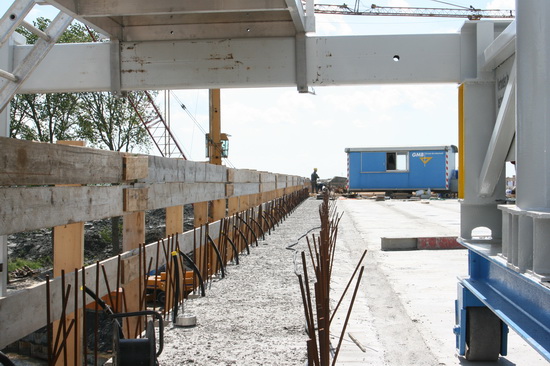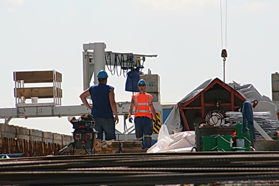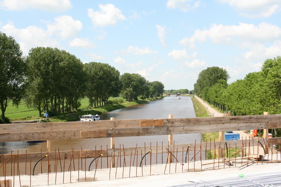 De eerste aanblik boven op de nieuwe brug van zo’n 150 meter lengte? Wanorde…. Maar dat komt doordat je…bams…in een keer allerlei dingen ziet die je niet altijd direct thuis kunt brengen… Veel staaldraad in ieder geval, hier valt nog wel iets te vlechten op dit noordelijk stuk tussen landhoofden en pijler.