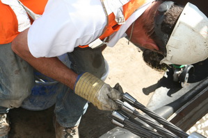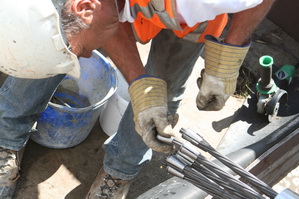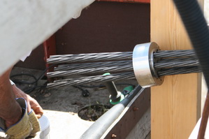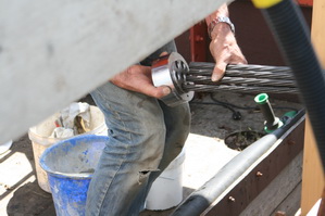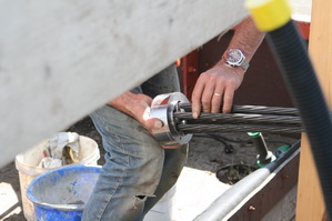 Voor dat naspannen zijn bundels van telkens 7 draden nodig. Die 7 draden worden gelijktijdig aangespannen met een hydraulische vijzel. Na het spannen (zo’n 6½ à 7 mm) worden de kabels afgeslepen en geïnjecteerd. Er komt beton (“net zo dik als yoghurt”) in het slangetje, zichtbaar op de foto’s. Dat beton blijft tot de volgende dag harden, dan wordt het slangetje eraf gehakt… (O jee, als ik het nou maar een beetje begrijpelijk heb verteld..)