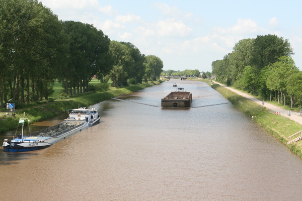 Vanuit het westen nadert een duwbak! De “Nelleke” ligt nog steeds aan de kant te wachten… Ik moet even bijkomen van de Spanstaalinformatie…