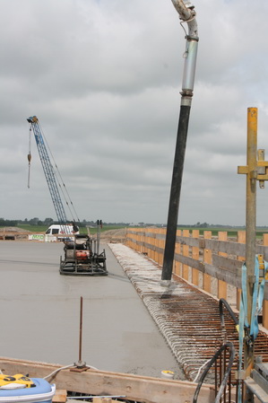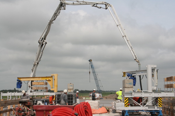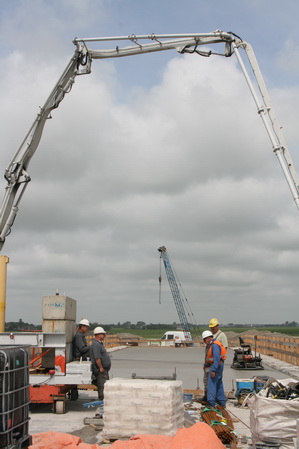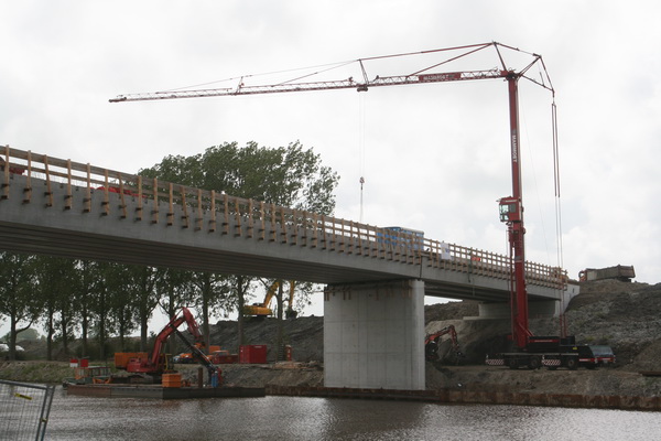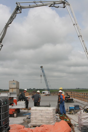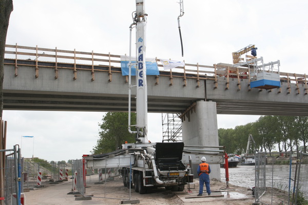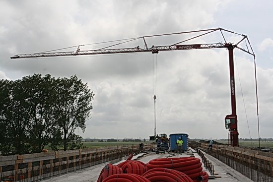 De betonpomp van Faber stond inderdaad nog standby, de lange arm met slurfachtige uiteinde kon zo weer zwenken naar het brugdek…