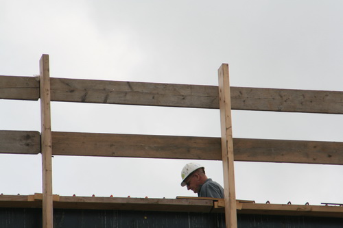 Zo, ik ben boven, kan meteen aan de slag. Het uiteinde van de betonpomparm beweegt zich naar de gewapende rand aan de oostkant. De vlindermachine staat stil, de betonvloer ligt er mooi bij!