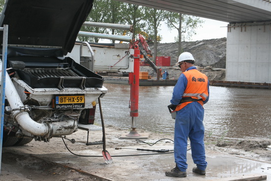 Kijk, de betonpomp wordt weer in stelling gebracht, de arm draait naar het brugoppervlak. De bestuurder staat beneden bij de pomp, met zijn kastje.