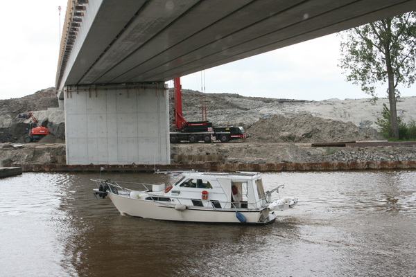 Vanaf de trap een foto gemaakt van de scheepvaart richting Groningen. Links en rechts de aanvoer van baggergrond die weer wordt gebruikt bij de grondlichamen van de noord- en zuideinde van de NVH-brug. Nog steeds wordt er nieuwe grond aangevoerd en door vrachtwagens en tractors met karren te bestemder plekke gebracht.