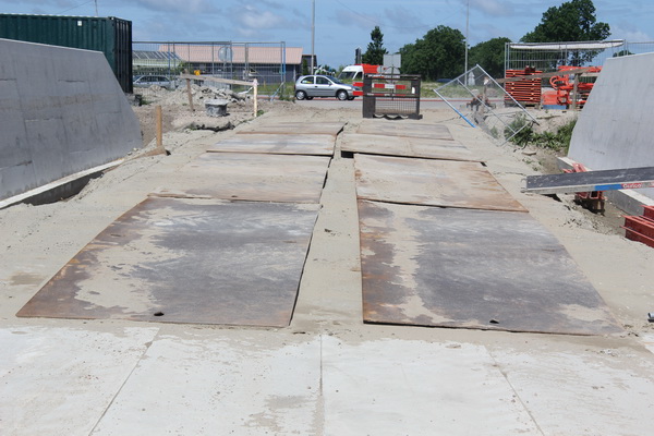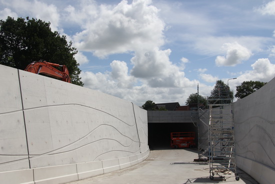 Het uiteinde van de tunnel nabij de rotonde, een deel van de steile helling dus (Hoedt u voor overdrijving…) De bestrating van moot 10 wordt gerealiseerd door Oosterhof Holtman, binnenkort…