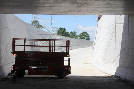 Foto richting de “echte tunnel” (een tunnel is pas een echte tunnel als ie overdekt is…). De kromming is goed te zien, evenals de profielen (van de grondlagen) op de binnenkant van de wanden…