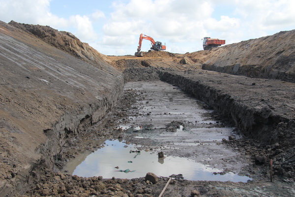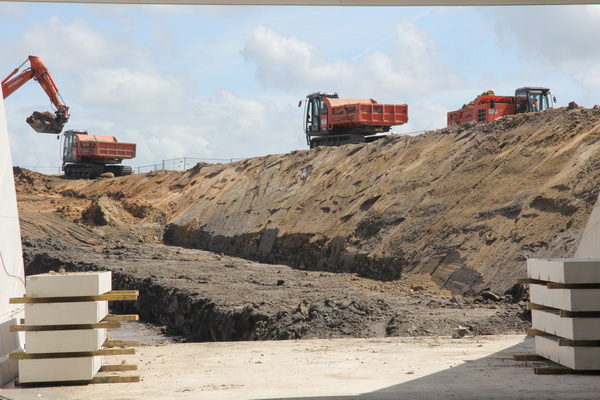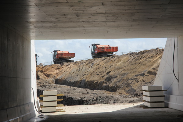 Het open uiteinde van de tunnel aan de oostkant, met zicht op de voortsnellende rupsvoertuigen, grondtransporteurs. Links en rechts? Nee, dat zijn geen gestapelde, gevulde taartdozen….