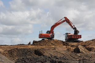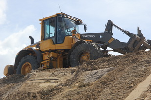 Links het vullen van de bak van een rupsvoertuig, rechts is een Volvo actief, een drukdoende schuiver, schaver, duwer…… Stamper?