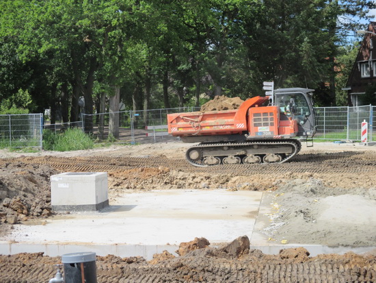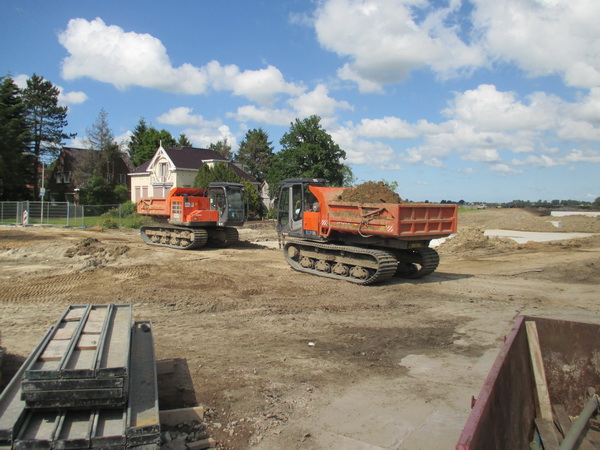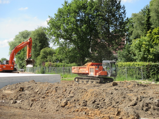 De rupsvoertuigen in actie in verband met het grondtransport richting de zijkanten van de tunnelkuip. De ‘noodweg’ heeft hier nogal onder te lijden gehad en er wordt een nieuw plaveisel aangebracht. (Maar het blijft een voorlopige oplossing…) De stremming wordt nu waarschijnlijk op vrijdag 4 juli opgeheven!