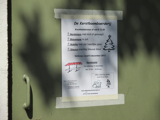 De Kerstboomboerderij verkoopt al vanaf 6 december 2013 kwaliteitsbomen voor €12,50….. Het gaat maar door, volgens de mededeling die (nog steeds) op het “stroomhok” aan de Oosterweg hangt…