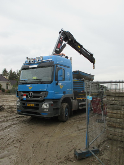 Nu de wegverlegging in de afrondende fase verkeert, wordt er vaak en veel opgeruimd. Hier een GMB-vrachtwagen die zelfs een bootje naar elders vervoert….