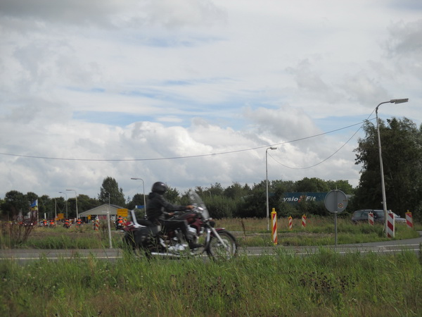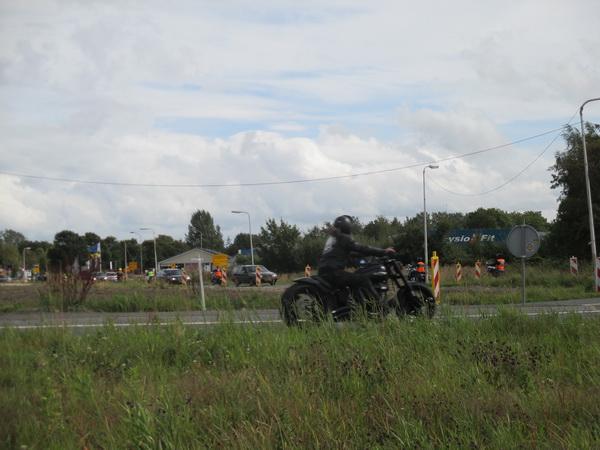 Ronkende motoren… Enkele tientallen motorenthousiastelingen passeren de rotonde in de richting van de tafelbrug.