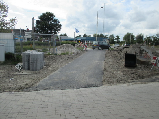 De nieuwe aansluiting van de Langestraat Zuid op de oude N355 en de Industrieweg. Nee, hier kan nog geen gebruik van worden gemaakt. Er is nog hoogteverschil, dus hier zullen de asfalteerders nog wel eens komen opdraven…