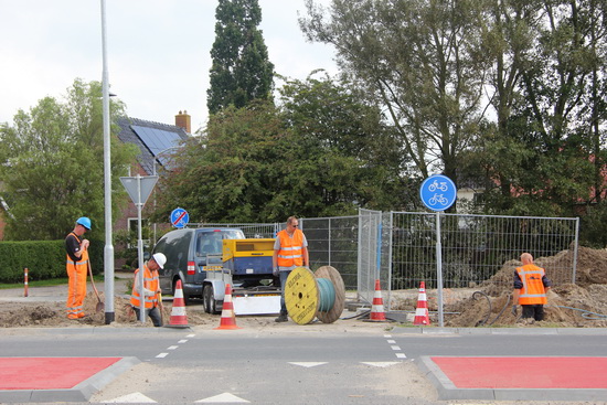 Situatie ter hoogte van de Schippersstraat West. Ook hier worden lantarenpalen geplaatst, waarmee vier oranjehemden zich bezig houden…
