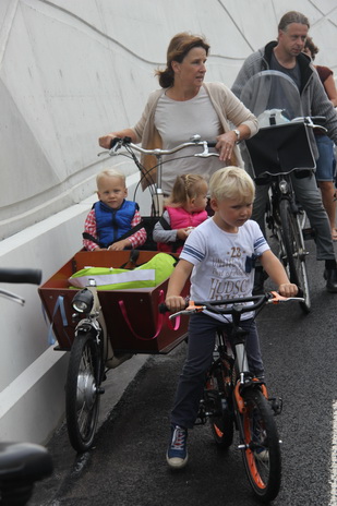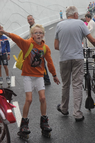 Mooi dat er ook heel wat dorpelingen van de zuidkant van het kanaal zijn gekomen om deze happening mee te maken. Jannie Mulder met schoondochter o.a. die stevig aanzettend de helling richting rotonde beproeven.