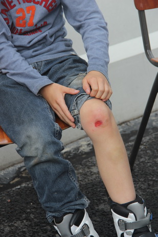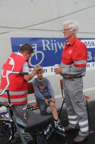 Ai! Toch nog iets te doen voor de Eerste Hulp! Kapotte broek, kapotte knie! (Doet me denken aan mijn eigen kindertijd, toen ik vaker viel dan me lief was… Was de ene knie genezen, zat er op de andere al weer een schaafwond…)