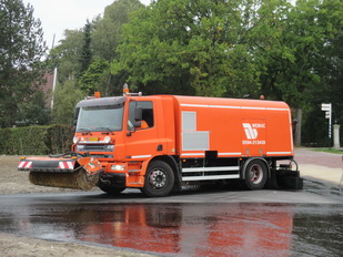 Oranje, waar je kijkt… De huiskleur van WEMAC, de werkmaatschappij van Oosterhof/Holman. Een veegauto? Waarschijnlijk kan deze zwaargewicht nog veel meer….. Het lijkt erop dat de auto een soort ‘lijmlaag’ legt voor het asfalt dat daarna als wegdek wordt aangebracht….